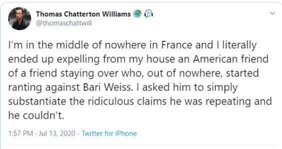 Chatterton, who is, like Weiss, a leading critic of the cancel culture, was nevertheless inspired to literally and physically cancel someone from his home in a fight over Weiss's work. (Before deleting his tweets, Chatterton tried to clarify that the offending individual “ended up self-expelling with my encouragement.”) Bari Derangement Syndrome is very much a thing.