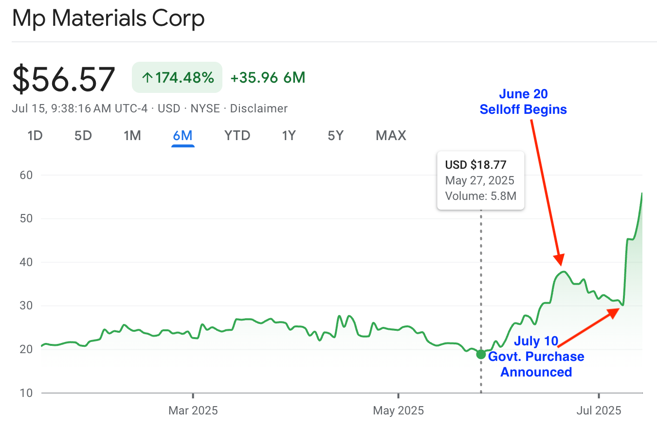 On May 27, MP began a sudden climb. After months of sitting around $25 a share, it moved consistently upward for a month, to almost $40. On June 20 a selloff started and the share price lost a quarter of its value over three weeks. The government announced its purchase on the morning of July 10 and MP went to the moon.