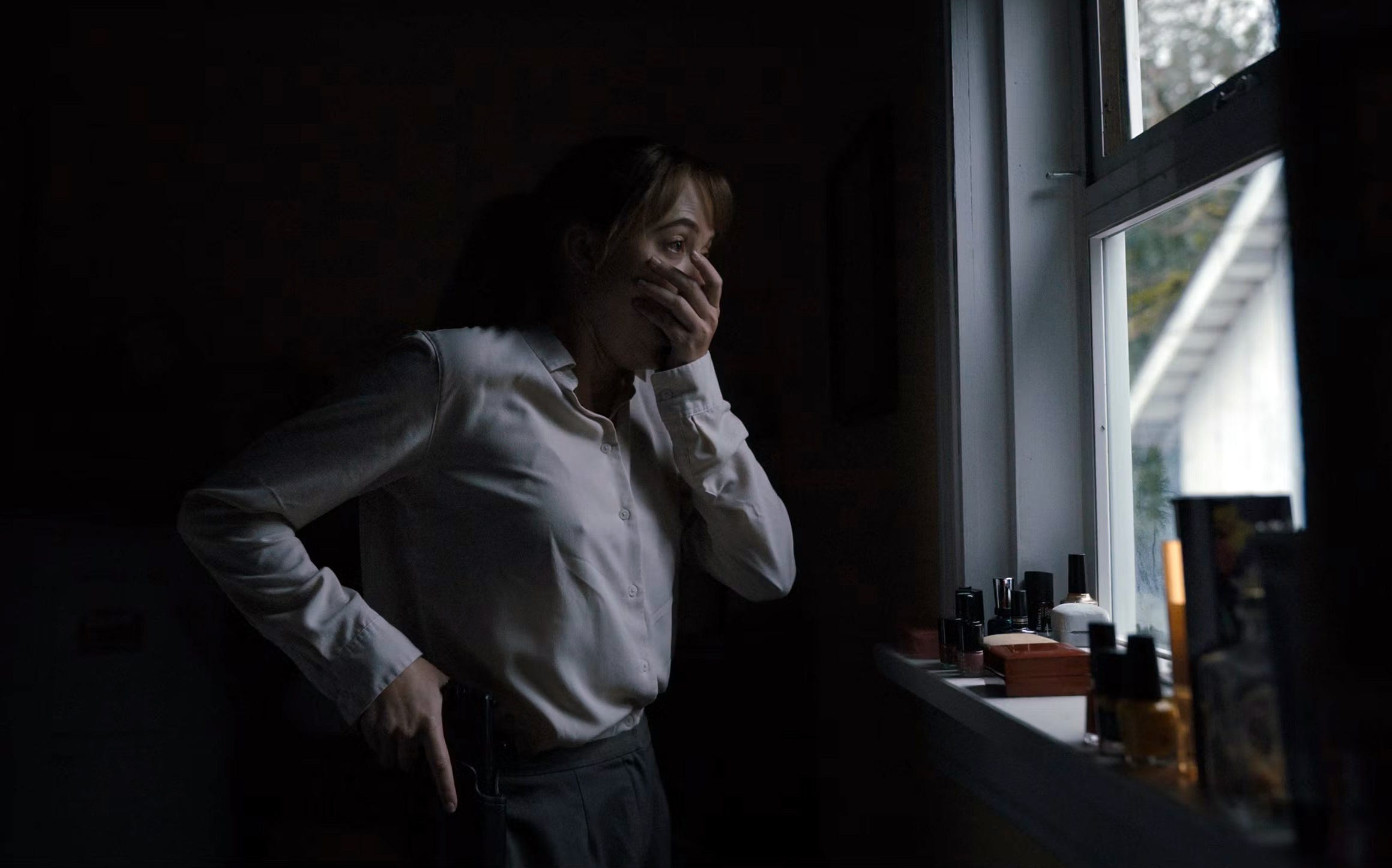 There’s a creeping dread at the heart of Oz Perkins’s Longlegs that becomes most pronounced when FBI agent Lee Harker (Maika Monroe) is by herself. When she’s in a library decoding messages from the killer known to authorities only as Longlegs (Nicolas Cage) and the lights are low and her back is to the open space. Or when she’s sitting at her desk in an empty cabin, a doorframe leading to a hallway conspicuously over her shoulder. Perkins loves framing Special Agent Harker in such a way; she’s often facing a window with an expanse behind her, lots of negative space into which we constantly—constantly—expect a figure to appear, as if by magic.
