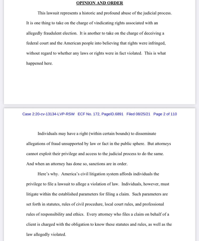 Declaring that the lawsuit should never have been filed, Judge Parker wrote in her 110-page order that it was “one thing to take on the charge of vindicating rights associated with an allegedly fraudulent election,” but another to deceive “a federal court and the American people into believing that rights were infringed.”