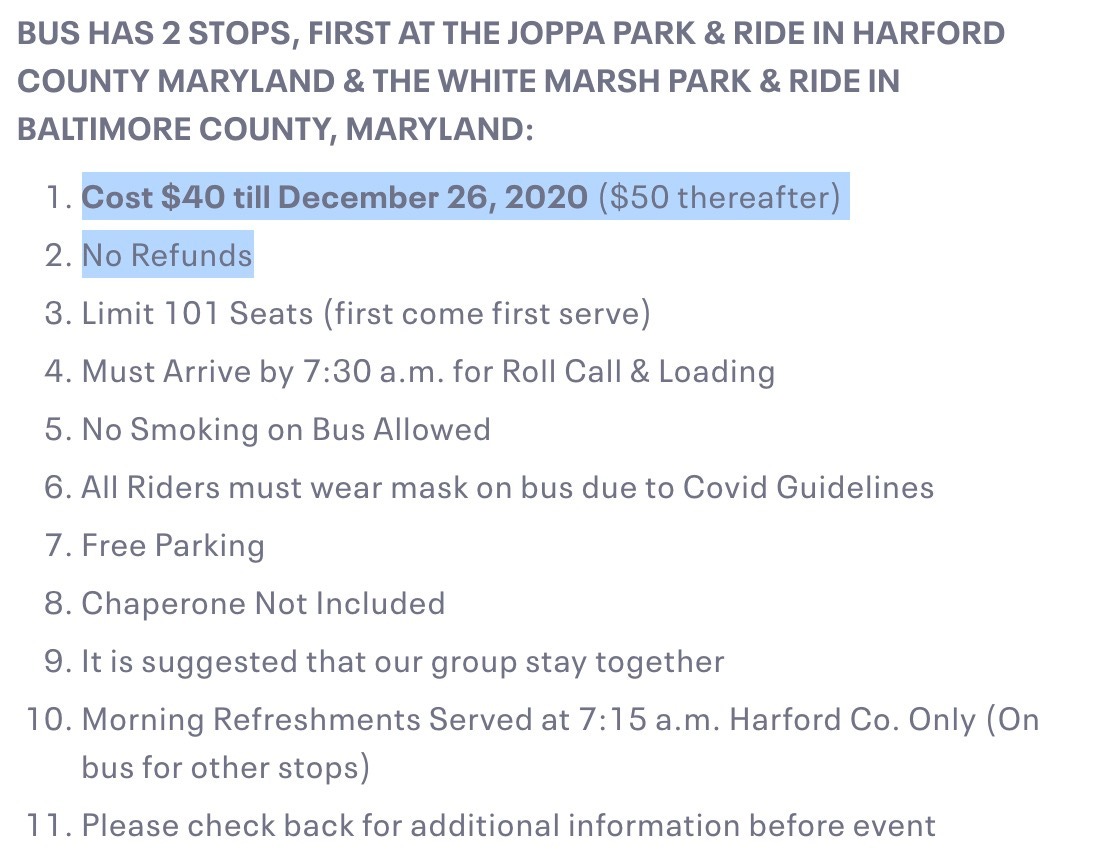 That’s right. Just give Reggie and Ashley $40 and you can board their bus at 7:30 a.m. on January 20 to go to President Trump’s second inauguration! But you better act soon, because while the early-bird price is $40 per ticket, after December 26 the cost goes up to $50.