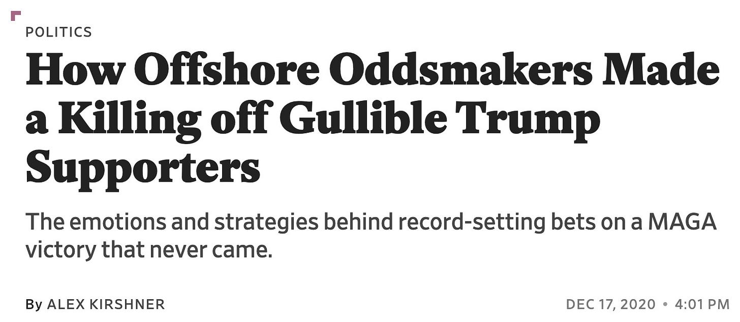 The betting markets were not good predictors, but they weren’t trying to be. The online bookmakers that fielded bets on the election saw their largest single-event windfall ever. To understand why, you need to understand election betting and Donald Trump supporters.