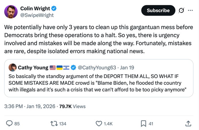 Here’s a case study in the omelets/eggs argument: Colin Wright, a Manhattan Institute fellow, in a tweet to his 284,000 followers, dismissed “isolated instances of ICE errors or overreach” as irrelevant: “No system is perfect. When you’re trying to deport millions of people there will always be errors. . . . We have a big mess to clean up and potentially not much time to do it in.” In a follow-up post, Wright stood his ground and clarified what he meant: the deportations need to be completed by the end of Trump’s second term.