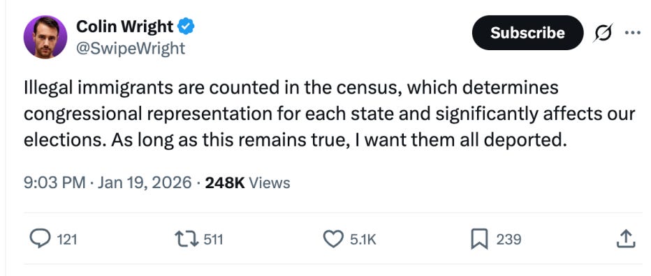 Other justifications for the omelets/eggs principle include the usual Stephen Miller-type Great Replacement fantasies and “Democrats flood [the] country with illegal aliens for votes” fearmongering. Given overwhelming evidence that illegal voting by noncitizens is vanishingly rare, some, including Wright and MAGA-friendly tech tycoon Palmer Luckey, have shifted to arguing that the real issue is census apportionment of electoral votes: