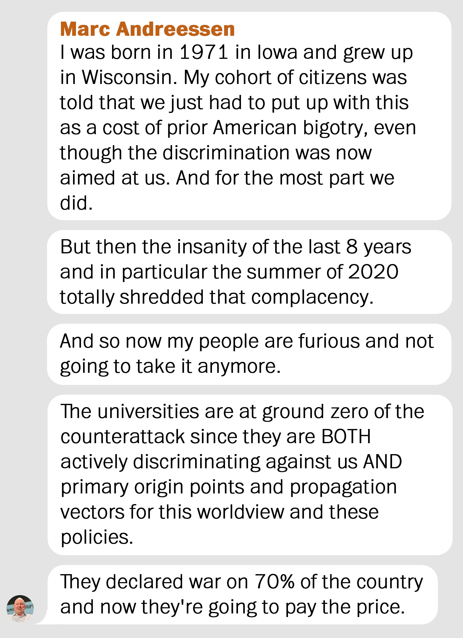You may not know Andreessen; outside of tech circles, he’s not as famous as Elon Musk and Peter Thiel. But like them, he is part of the Silicon Valley oligarchy that has thrown in with Trumpism.