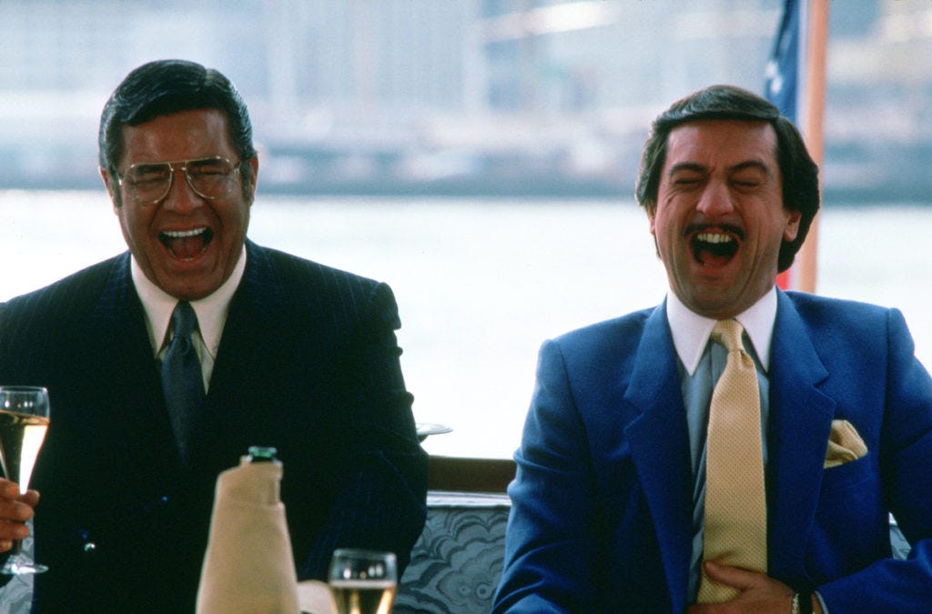 Eagle-eyed viewers, and those who object to what I’m getting at here, may wish to point out that The Wolf of Wall Street does include its own “people dancing energetically” scene that is played for laughs. I have no choice but to admit that this is true, but I’d argue in the case of the Scorsese film there is at least an extra layer to it, which is that by that point in the story the audience is aware that all of these guys are basically complete dorks, and for all their financial success, their confidence is unearned. Such is not the case when The Bubble starts piling on these scenes, or even Tropic Thunder, though the latter film comes closer to being on the right side of history. In other words, there’s a lack of specificity to the characters in most modern comedies. The reason Scorsese’s The King of Comedy (1982) is funny isn’t because Rupert Pupkin’s jokes are any good (well, "Hit me, hit me. What's the matter with you? Don't you want to graduate?" isn’t bad) but because the audience comes to know him. His “Pride & Joy” bit sucks, but the comic timing created by Scorsese, Robert De Niro, and Catherine Scorsese when Pupkin is trying to record an introduction to his talk show that doesn’t exist, only to be constantly interrupted by his mother, is so exquisite that it’s very difficult to believe that a career in comedy isn’t what all of these people have been working toward their whole lives. But crucially, that moment is also pitiful. Pupkin is pathetic. The laughter is impossible to hold back, but we’re not laughing with the character. Pupkin will eventually do some things the audience can’t, or anyway shouldn’t, get behind, but in a sense our laughter, what he would consider “bad laughs,” pushed him there.