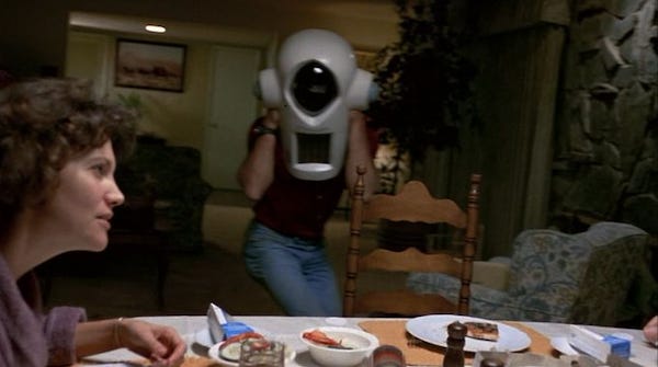 First, there's the Japanese-made wall-mounted heat-sensitive cameras, “but to catch what those can't,” you have the Ettenauer 226-XL, an unwieldy, absurd-looking contraption that fits entirely over the head of the camera operator. These both justify a myriad of shots that a real documentary probably couldn't get, and also, in the case of the Ettenauer, add jokes. That cameraman sweeping by the dinner table, for one, but better yet is the shot of the cameraman slipping past Francis Lee McCain and out the front door, which is both a funny image and also justifies the shots in the front yard we see after that. It’s worth noting that both of these scenes involve domestic tension between McCain and her husband (Charles Grodin), sparked by Brooks’s character and his documentary crew, which these shots both somehow heighten and defuse.