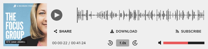 The latest episode of my new podcast, The Focus Group with Sarah Longwell, is out. The Bulwark’s Tim Miller joins me to discuss focus groups with Trump supporters in Ohio and Georgia, two states that feature crucial 2022 Senate races with Trump-endorsed candidates. Hear what we’re thinking about Josh Mandel, Herschel Walker, and more.