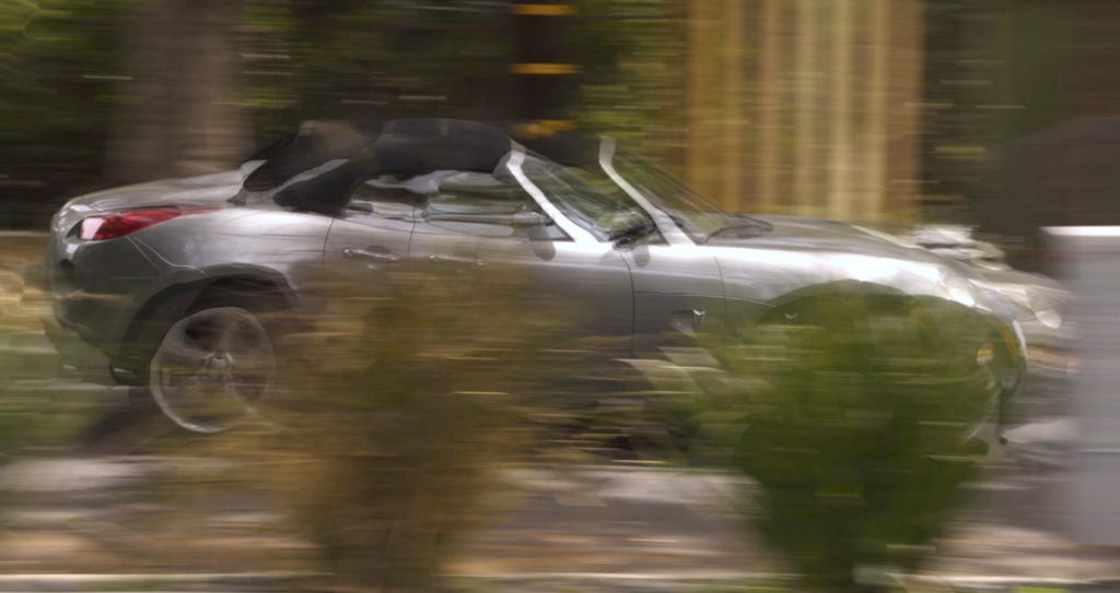 A frame of footage showing a car passing behind some bushes. Image credit: Bill Bennett ASC.