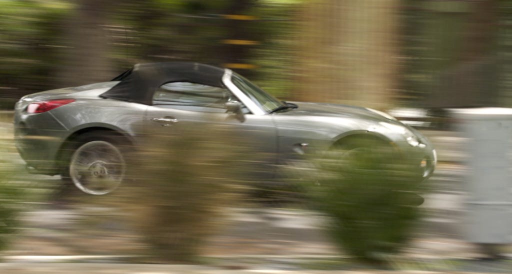 When the motion smoothing algorithm tries to understand this picture, it fails spectacularly to figure out which parts of the image are bushes (moving rapidly to the left) and which parts are the car (stationary with respect to the picture).