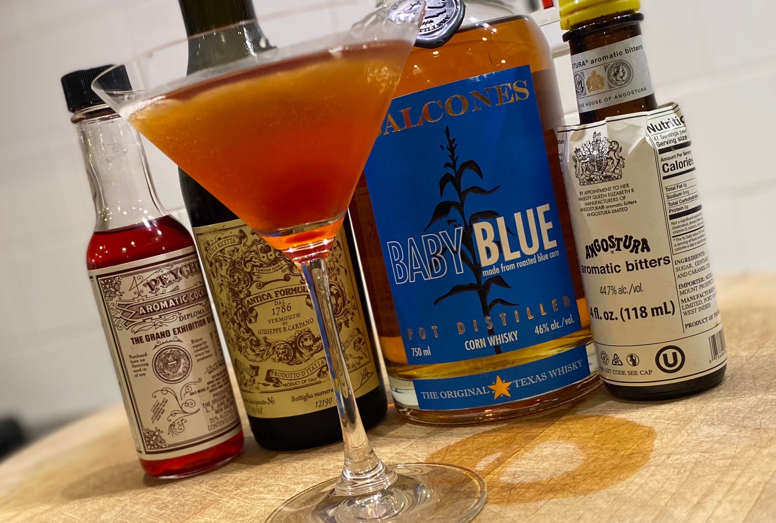 Anyway, 4.62 ounces is all you need when pouring two ounces of Balcones Baby Blue, one ounce of Antica Formula vermouth, and a couple dashes each of Peychaud’s and Angostura bitters—shaken, not stirred—into a martini glass. There’s even room for a cherry, if you desire it.