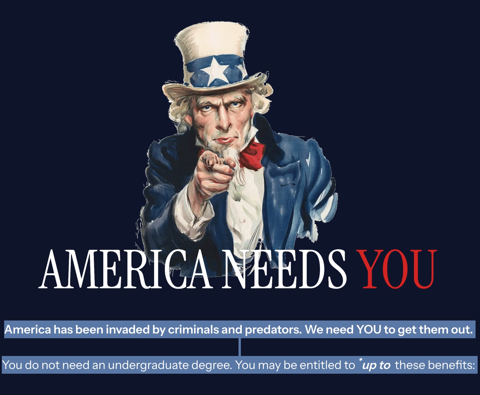 The fine print reads: “America has been invaded by criminals and predators. We need YOU to get them out.” The ad goes on to say that applicants need not have an undergraduate degree and are eligible for a signing bonus of up to $50,000 and up to $60,000 in student loan repayment. That’s great, because a lot of older people like me are still paying off their student loans.