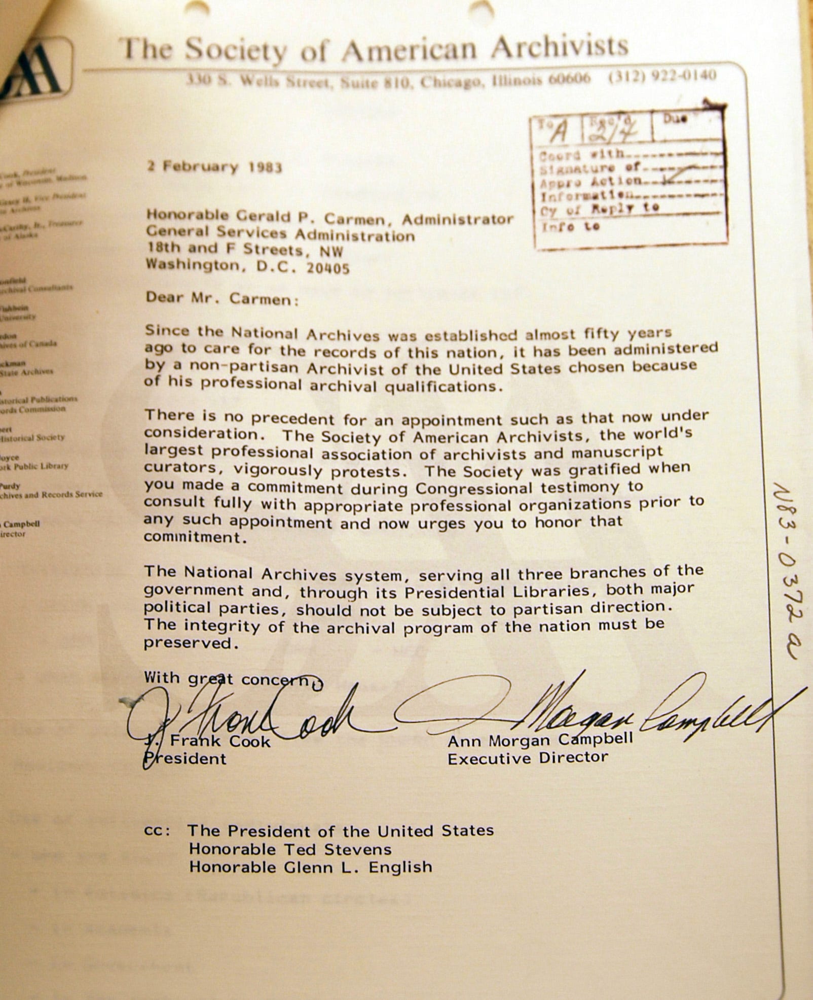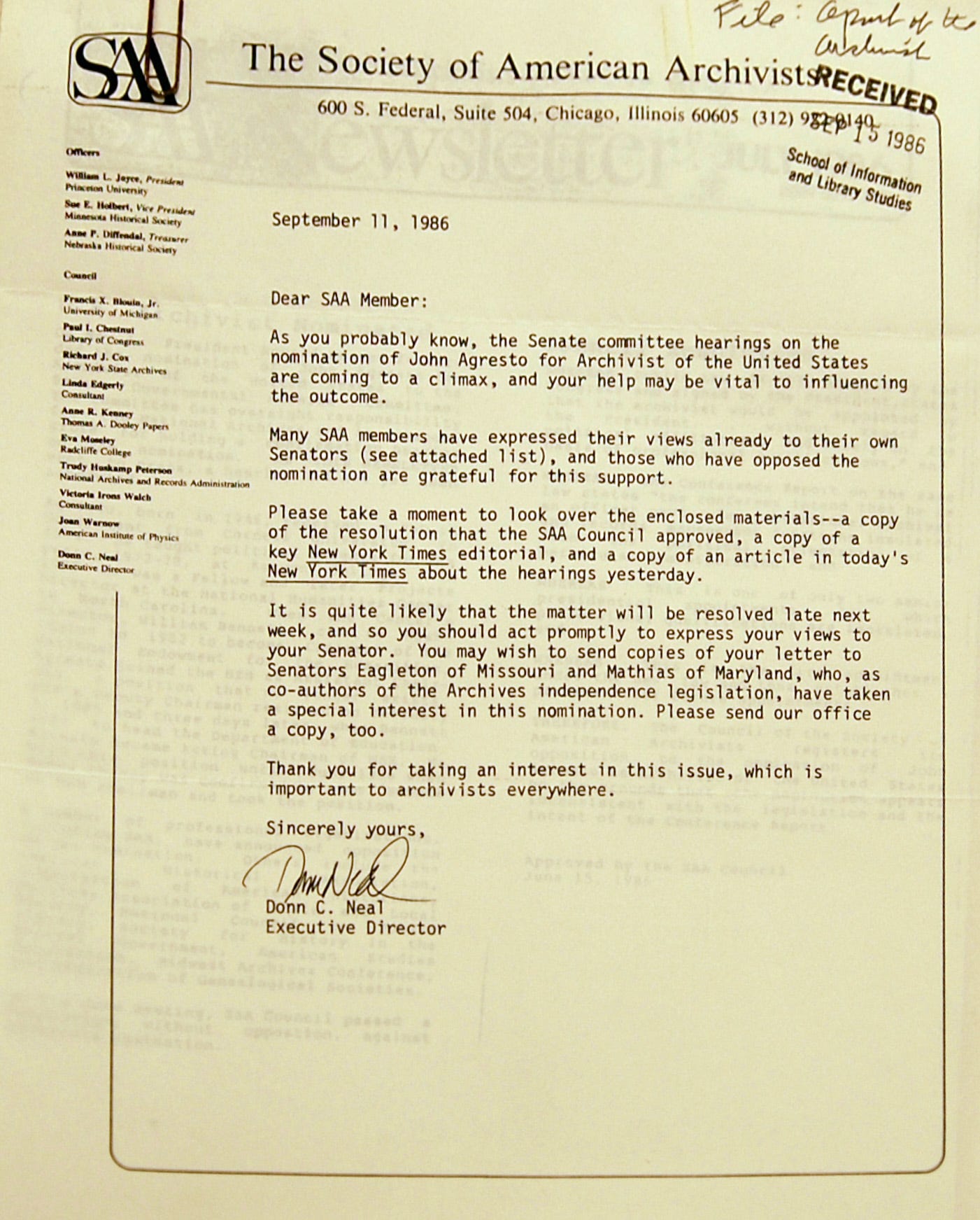 The avalanche against Agresto was considerable. Professional organizations publicly and forcefully protested his nomination. Thirteen groups representing NARA’s main records users formally opposed him. The Society for History in the Federal Government warned that his confirmation would “decisively impede the aura of impartiality and professional detachment required for such a position of national trust.”
