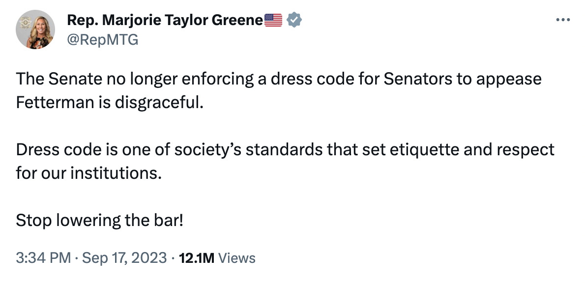 Schumer’s move was thought to appease freshman Sen. John Fetterman (D-Pa.), who has become known for his extremely casual attire. Fetterman regularly sports gym shorts1, hoodies, and clearly lived-in Carhartt work shirts. He skirted the earlier rules on attire in the chamber during votes by popping his head in the door when his name was called and signaling a thumbs up or down to the clerk2.