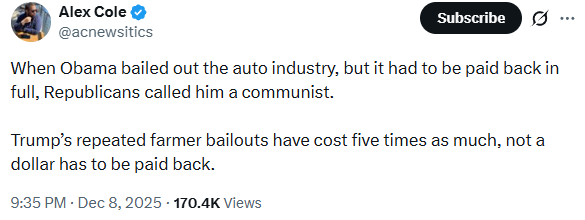Now, we’re no golden-age experts. But it sure seems like a golden age that was here just moments ago, but is now just around the corner, is getting farther away. On that same note, Trump announced yesterday a $12 billion bailout of U.S. farmers hurt by his trade wars—news that probably came as a surprise to anyone who spent the entirety of his first term in a coma. “We love our farmers,” Trump said, “and as you know, the farmers like me.”