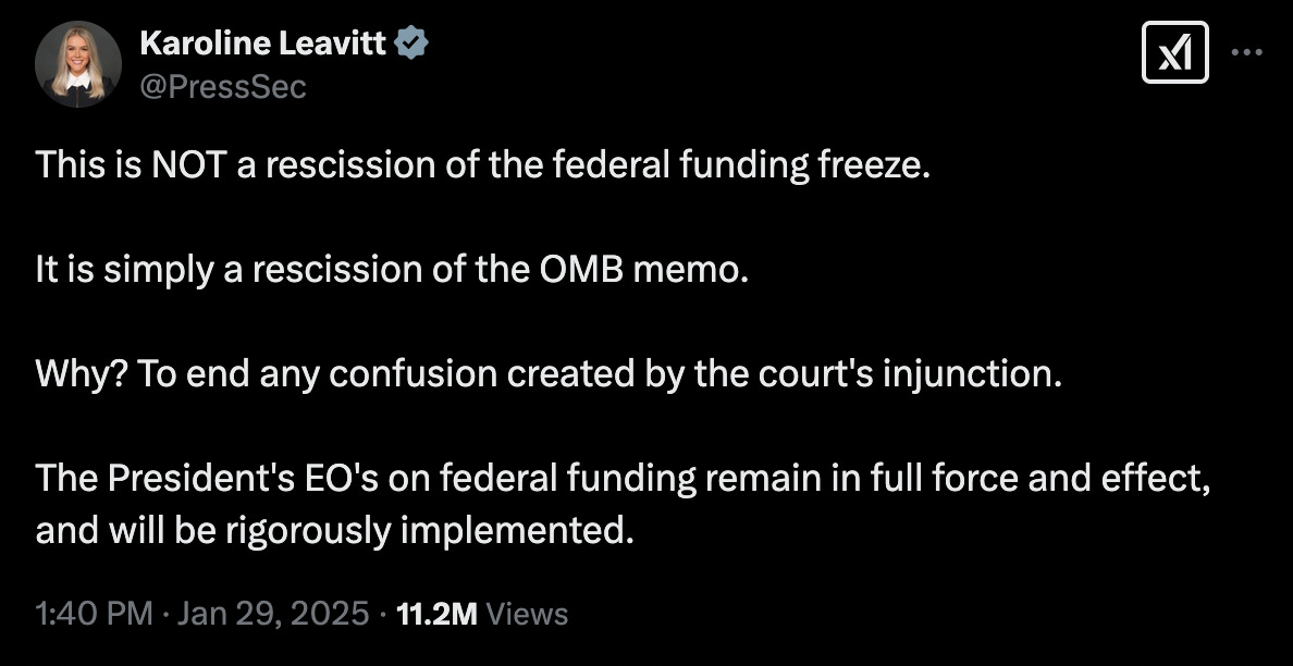 First, the Office of Management and Budget (OMB) issued a memo alerting relevant agencies and the public of a freeze on federal grants and loans across the board to allow time for them to be reviewed for their implication in “woke gender ideology” and other ideological bugaboos, causing immediate and widespread confusion and outrage. Then, a federal judge blocked the freeze. After that, OMB issued another two-sentence memo rescinding the funding freeze. Minutes later, White House Press Secretary Karoline Leavitt announced that, actually, it was the memo that was rescinded, not the freeze.