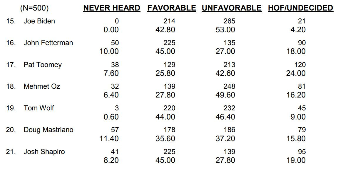 First the topline. Democrat John Fetterman is comfortably ahead of TV personality Dr. Mehmet Oz, leading in the race by 9 points, 46 percent to 37 percent. Considerably less comfortable is Pennsylvania Attorney General Josh Shapiro, the Democratic candidate for governor, who is ahead 44-40 over GOP State Representative/QAnon-adjacent/January 6th protester Doug Mastriano, a gap within the poll’s margin of error.