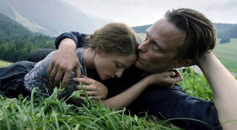 A great film about the tragedy of totalitarianism. Not about the horrors of totalitarianism—Franz Jägerstätter’s journey does not take him to the concentration camps, though his refusal to accede to Hitler does cost him his life—but about the way it warps everything, demanding loyalty, turning neighbor against neighbor. The refusal to join someone who is obviously wicked leads to the belief from those who have joined that you find yourself to be superior, that you think of yourself as better. They judge themselves because they think you, the refusenik, are judging them. That judgment brings shame.