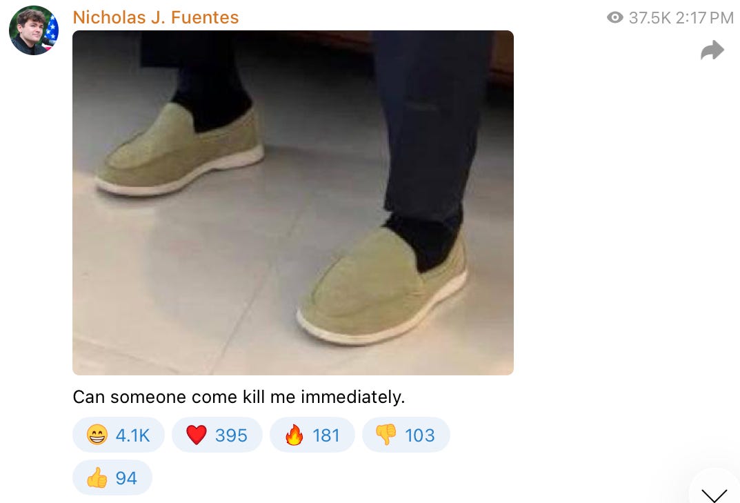 “Can someone come kill me immediately,” Fuentes wrote in a Telegram post, zooming in on Lawrence’s clunky taupe loafers.
