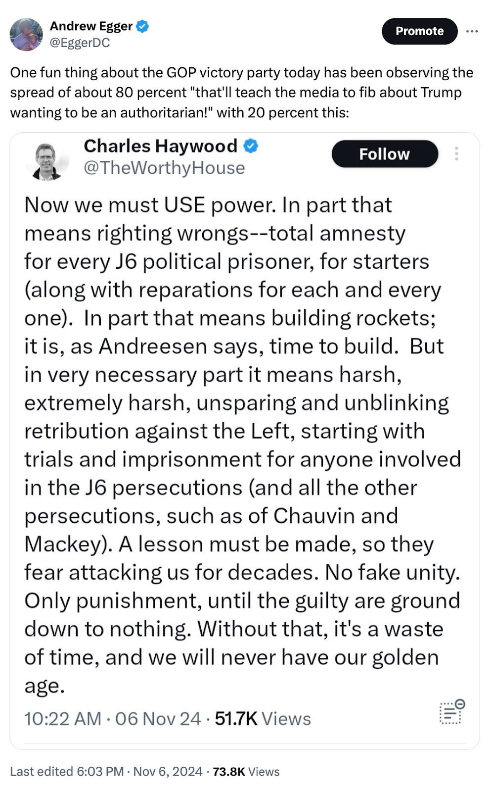On the merits, the case to fear Trump’s authoritarian aspirations is straightforward. We’ve made it many times here; we won’t litigate it all again this minute. All it really requires is looking at Trump’s own actions and words: When he tells you who he is, believe him.