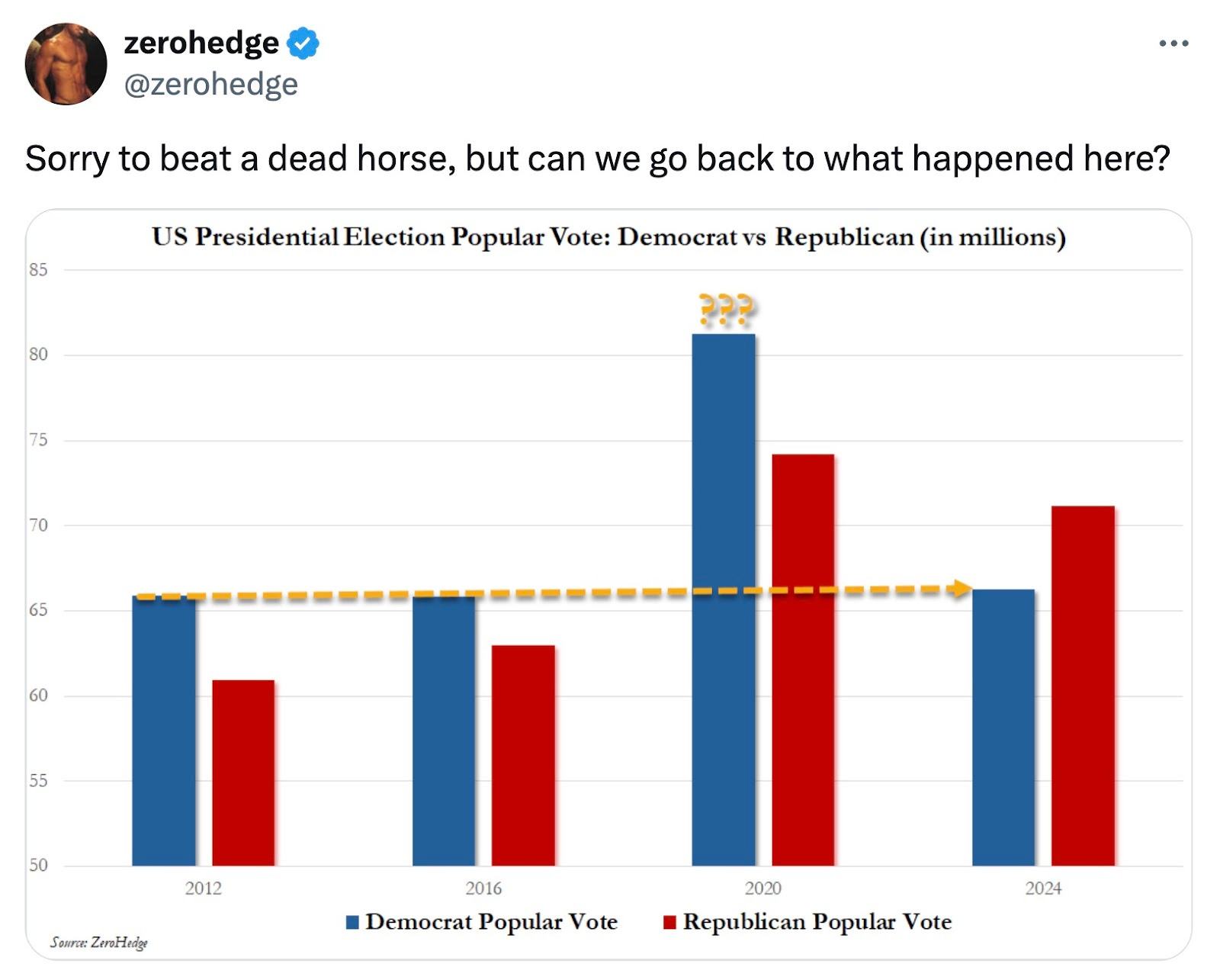 Maybe you remember 2020, the year of the dawn of COVID and the George Floyd protests. People were pretty worked up! Turnout was high! But the real problem is that this graph was created long before all the ballots had been counted. As of today, Trump leads in the popular vote 72.6 million to 68 million, with lots more counting left to be done. (California only has half its vote in!)