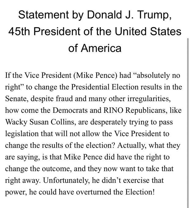 But, as with his hints of pardons and threats of unrest on Saturday night, Trump’s latest claim is notable for its lack of subtlety. In his latest statement from Mar-a-Lago, Trump ripped bipartisan attempts to amend the Electoral Count Act and offered his own novel gloss: “Actually, what they are saying, is that Mike Pence did have the right to change the outcome, and they now want to take that right away. Unfortunately, he didn't exercise that power, he could have overturned the Election!"