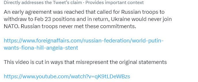 (Among those who shared Tracey’s tweet: Thomas Massie, the Republican congressman from Kentucky.) There’s only one problem: Bennett didn’t actually say what Maté and his amen chorus claimed he said. In fact, when Maté posted a two-minute video clip condensed from the Bennett interview (the Russia/Ukraine portion of which is over half an hour long and starts at about two and a half hours in), his tweet soon had a “community note” appended to it providing some helpful context—including the fact that the video clip was deceptively cut: