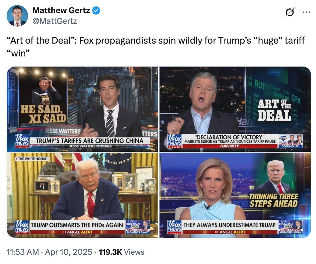 An all-out trade war with China, the insane tariffs, the only temporary pause in the insane tariffs, the character of the Trump administration’s decision-making—all of this has markets thoroughly and understandably spooked. Wednesday’s equities rally was short-lived, the slide in the dollar continues, and most worrisome perhaps, the flight from U.S. treasuries shows no signs of abating.