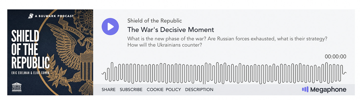 Eric and Eliot dissect the war in Ukraine and discuss Eliot’s articles in the Atlantic and Foreign Affairs. What is the new phase of the war? Are Russian forces exhausted, what is their strategy? How will the Ukrainians counter? Is the Biden package enough? Eliot asks Eric about the lessons of Ukraine for other parts of the world and his Bulwark article on ending the policy of strategic ambiguity for Taiwan. Should we settle in for a long war of attrition?