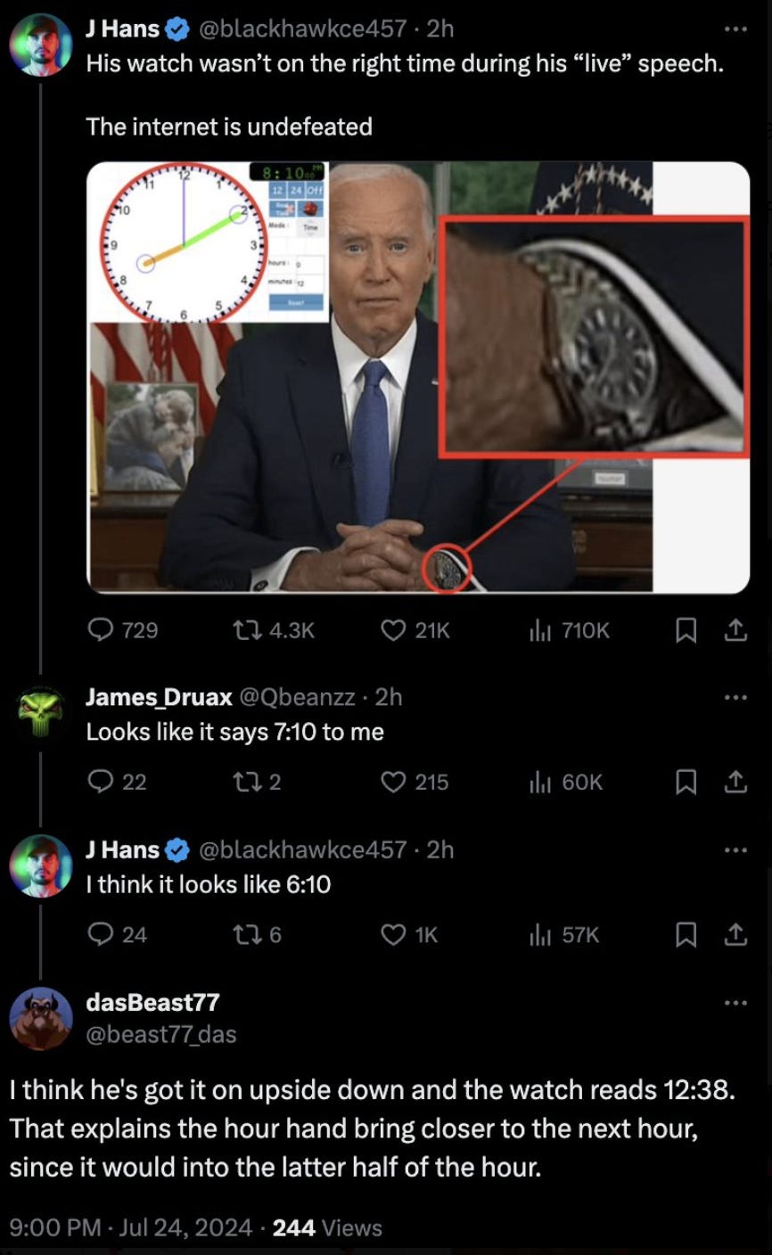 Last night Twitter created a conspiracy over Joe Biden’s watch, which was set to the wrong time or something . . .