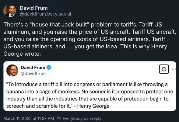 It bears reflecting for a minute on the hand Trump currently holds. His sheer capricious scorn and malice have forged, out of practically nowhere, a political coalition of anti-American zealotry in Canada, our heretofore friendly neighbor in the north. He belittled them as unworthy of nation status, rolled his eyes at our historic ties, and threatened them with the “friendly” possibility of absorption as our 51st state. And then he instigated a game of economic chicken with them.