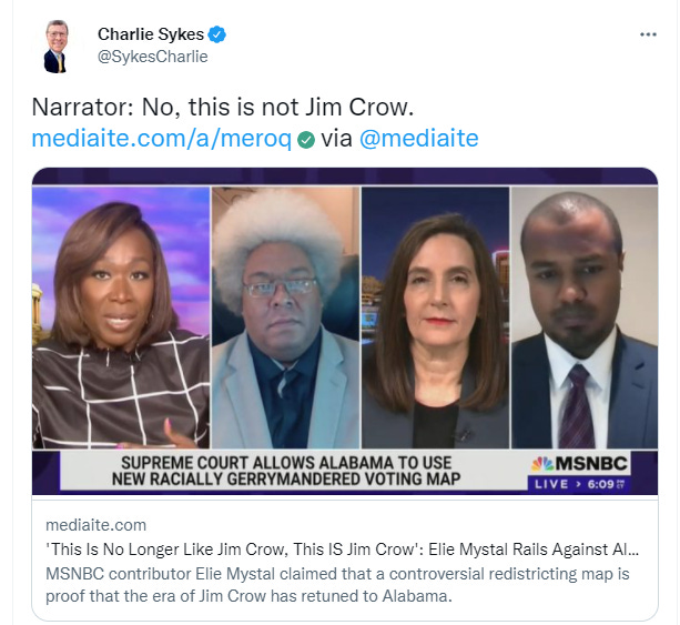 Again, I wish the court had upheld the lower court ruling. But, ahem, this is not literally Jim Crow. The case was about gerrymandering, which is a serious issue. But it did not impose poll taxes, literacy tests, or strip any voter of their right to cast a ballot.