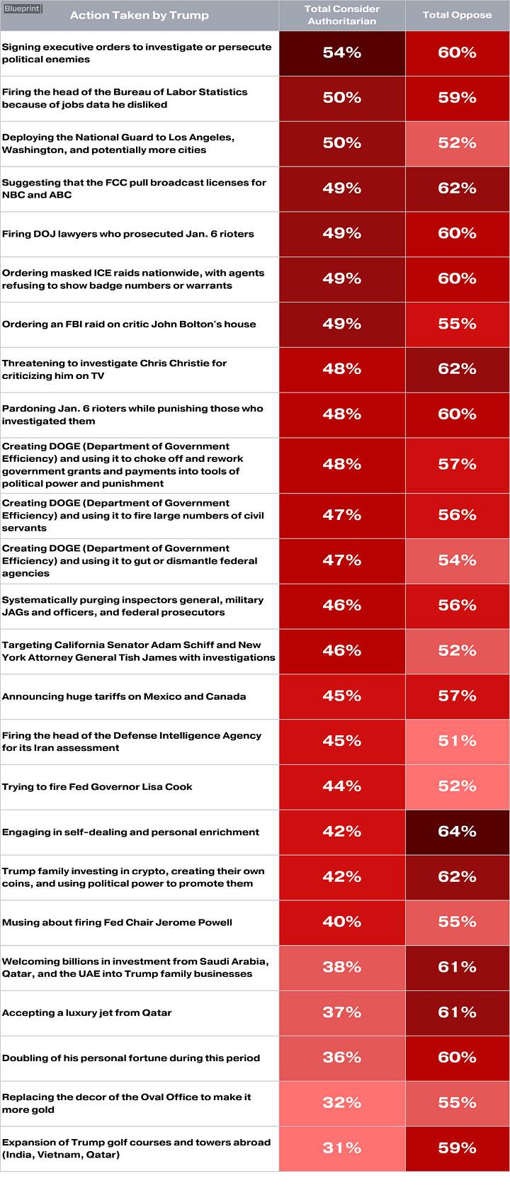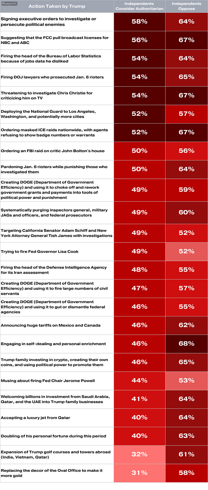 That’s the main takeaway from new polling from Democratic research firm Blueprint Strategies, shared first with The Bulwark today. Blueprint asked voters a series of straightforward questions about 25 of Trump’s most controversial policies and actions this year: Do they consider those actions authoritarian? And do they approve of them? The answer was, largely, “yes” and very much “no.”
