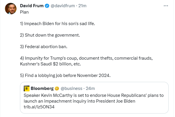 But she’s still calling the shots. Via Punchbowl News: “McCarthy will endorse impeachment inquiry this week.”