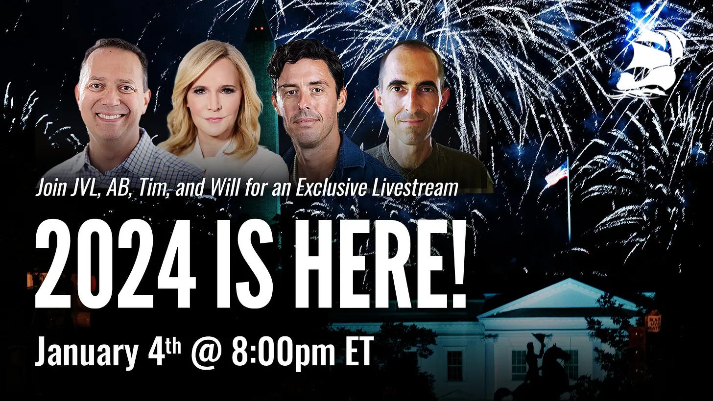JVL is joined by Tim Miller, A.B. Stoddard, and Will Saletan to ring in the new year and discuss what 2024 might hold for America.