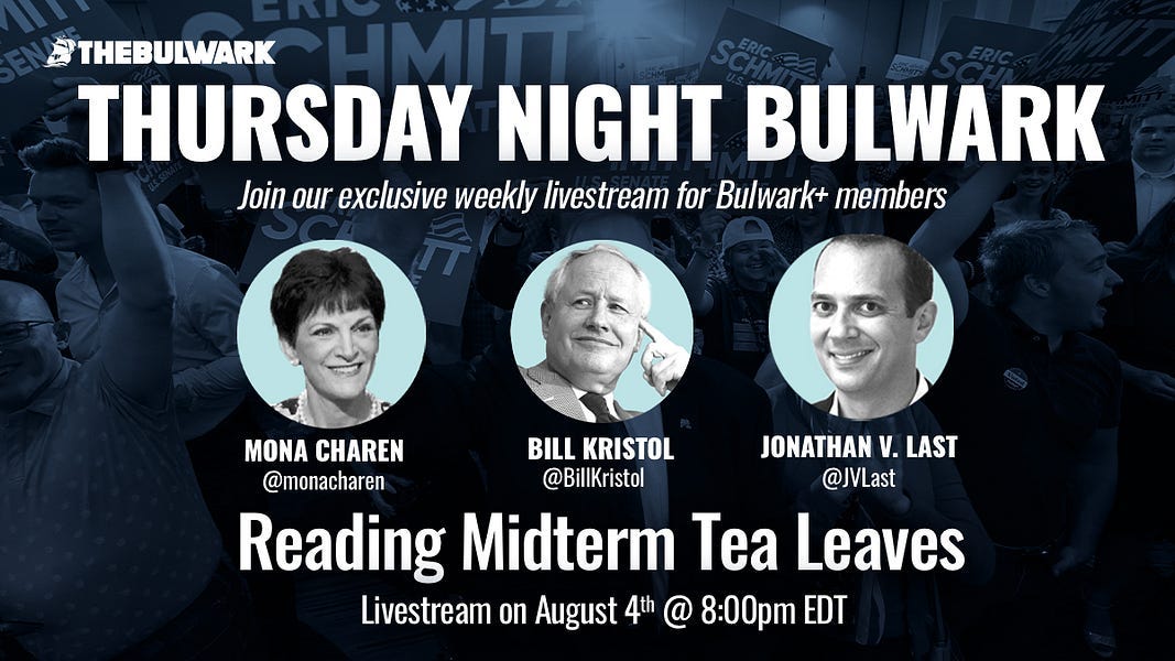 Bulwark+ TakesPodcast: Reading Midterm Tea Leaves [8/4/2022]Benjamin ParkerAug 05, 2022∙ Paid3821ShareThis post is for paid subscribersJoinAlready a paid subscriber? Sign inPreviousNext