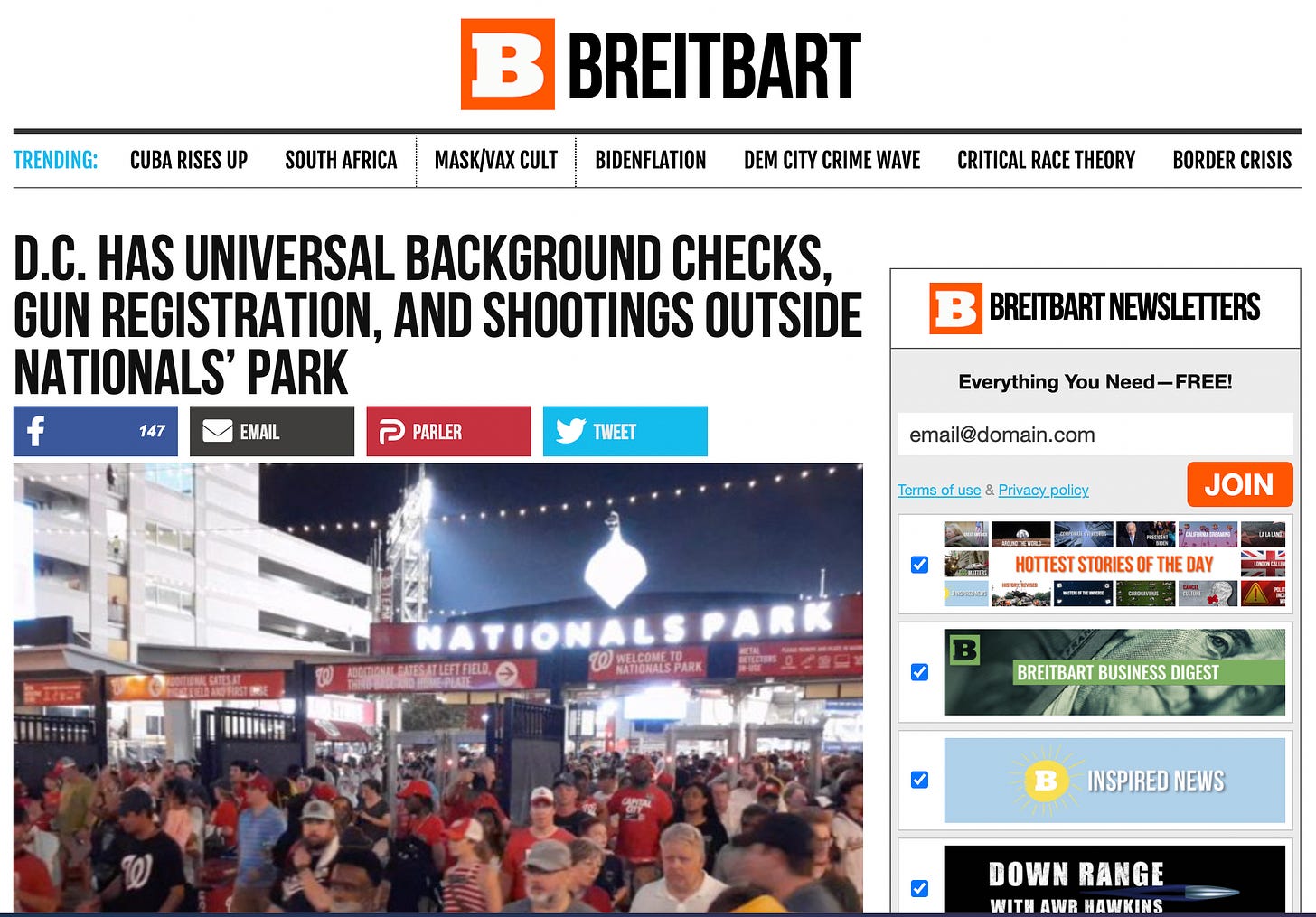 Democrat-run Washington, DC, has stringent gun controls including universal background checks and gun registration, yet three people were shot outside Nationals’ Park on Saturday night in a game against the Padres.