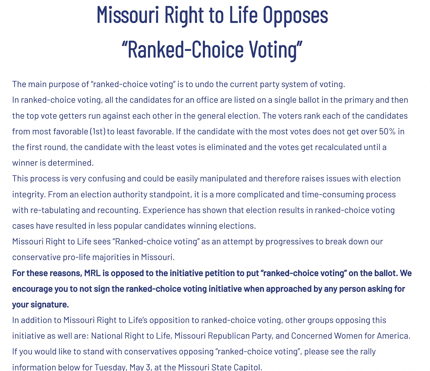 Oh hey, this is kind of funny: The day before the Alito draft leaked, the group Missouri Right to Life was fulminating about the evils of . . . ranked choice voting: