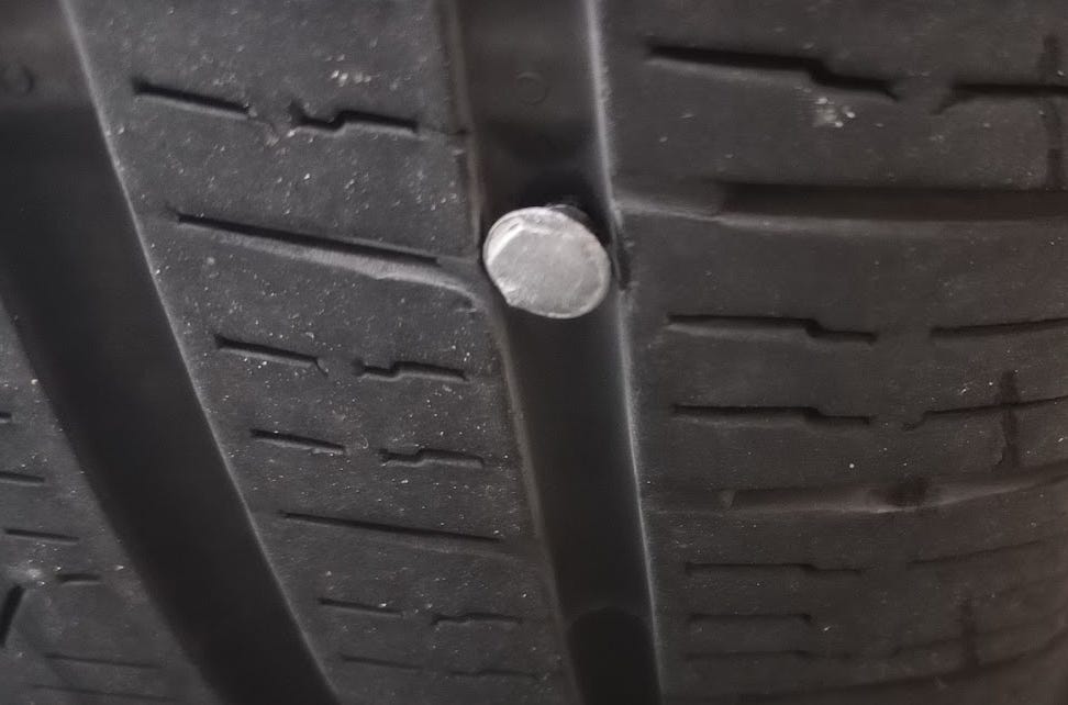 A Friday that feels like a Monday⌠Much to the consternation of my twins, I had to return our rental car today because ours was in the shop for repairs due to a rear-ending. We got a MINI Countryman. The girls named him Coopah. They adored him. It was a very fun car! The repairs were finalized and after removing the car seats, I set off to return the car and return to normalcy. Until the system told me the tire was flat. It didnât look flat, like a slashed tire. So I drove it to the nearest gas station which⌠had an out of order air pump. Great. Could I use Fix-a-Flat? I called. The rental agency said yes. It worked. I returned the car and⌠lo and behold. A nail.