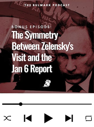 The fight against Putin and the fight against Trump are cousins, so how poetic is it that Zelensky and the January 6 report both show up on nearly the same day? Plus, is Trump getting too tired to fight? Bill Kristol joins guest host JVL for a special bonus episode.