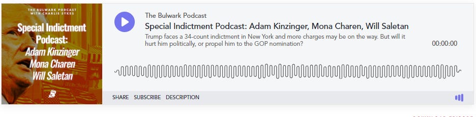 Trump faces a 34-count indictment in New York and more charges may be on the way. But will it hurt him politically, or propel him to the GOP nomination? Adam Kinzinger, Mona Charen, and Will Saletan joined me for the weekend podcast.