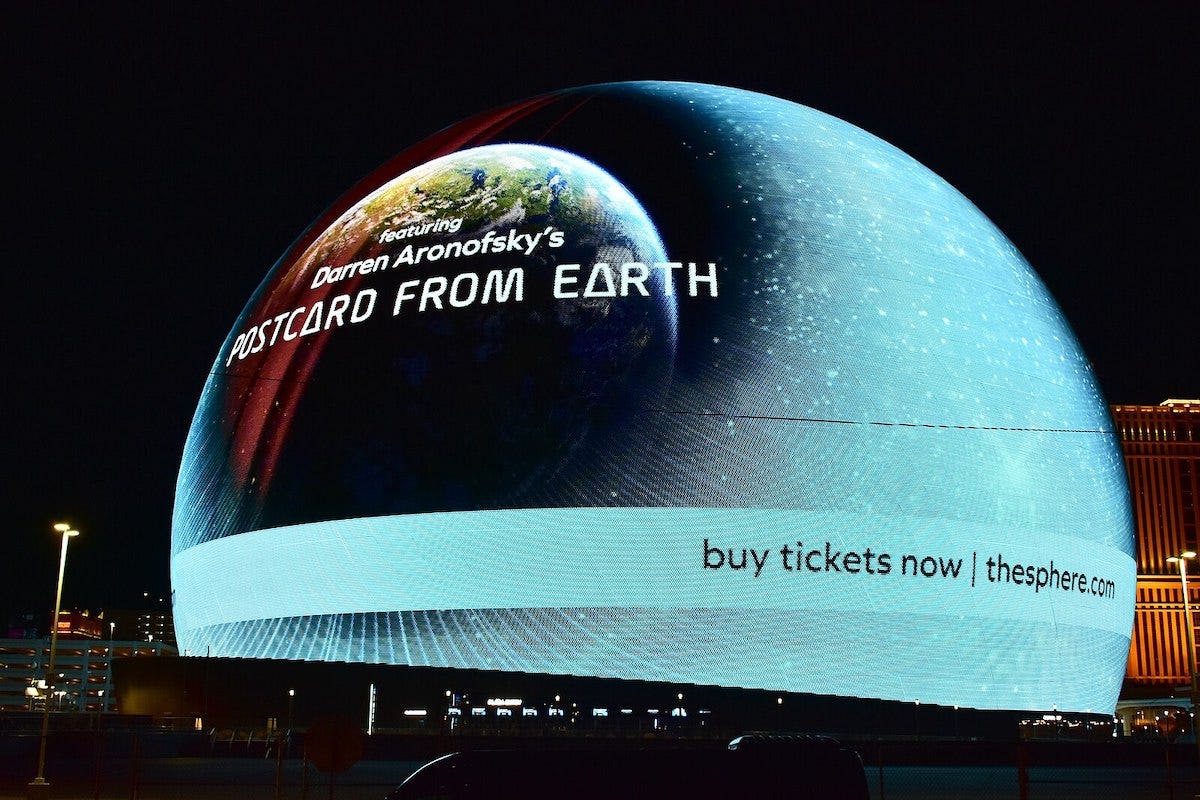 The lecture at the heart of Darren Aronofsky’s Postcard from Earth, the 50-minute documentary playing at the MSG Sphere in Las Vegas, isn’t necessarily the most important part of the experience of seeing a movie in the Sphere (I’ll get to that in a bit), but it’s certainly an interesting part of the experience of seeing a movie in the Sphere, because Aronofsky has, as my friends and I joked after seeing it, made the most anti-Sphere movie one could possibly play within the Sphere.