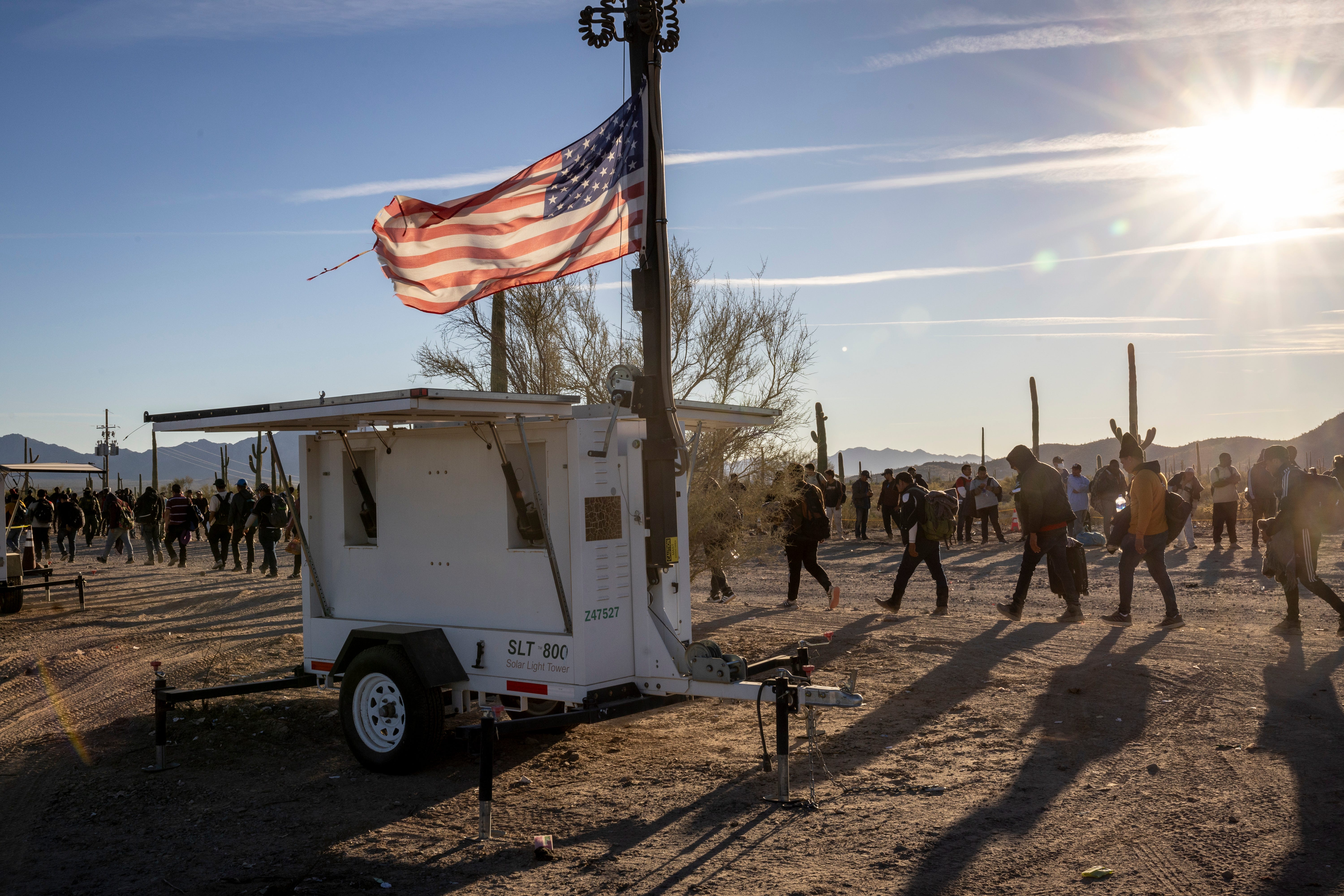 Immigrants arrive to a remote U.S. Border Patrol processing center after crossing the U.S.-Mexico border on December 07, 2023 in Lukeville, Arizona. A surge of immigrants illegally passing through openings cut by smugglers in the border wall has overwhelmed U.S. immigration authorities, causing them to shut down several international ports of entry so t…