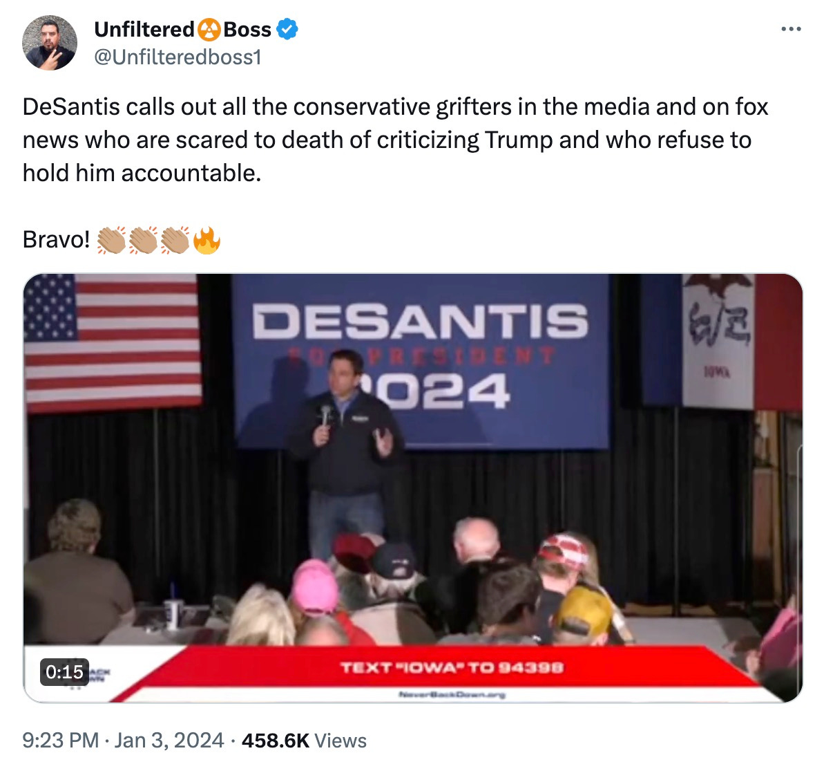 It is amazing that DeSantis (a) waited until after his candidacy had flatlined to criticize Trump; (b) then did so on the narrowest possible grounds; and then (c) whined about other people not taking Trump on for him.