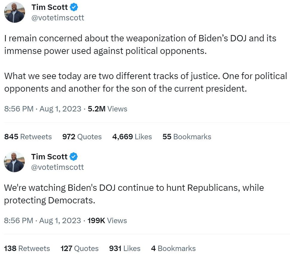 These findings, and the effort to conceal them, have been met with silence from the GOP presidential field. And of course, Christie is the only candidate who qualified for the debate who is more disturbed by the evidence presented by the special counsel in Trump’s new criminal charges than Hunter Biden’s business dealings. Does all this outrage about a “two-tiered” justice system permit these Republicans to concede also that Biden did not “become president,” but indeed won the election?