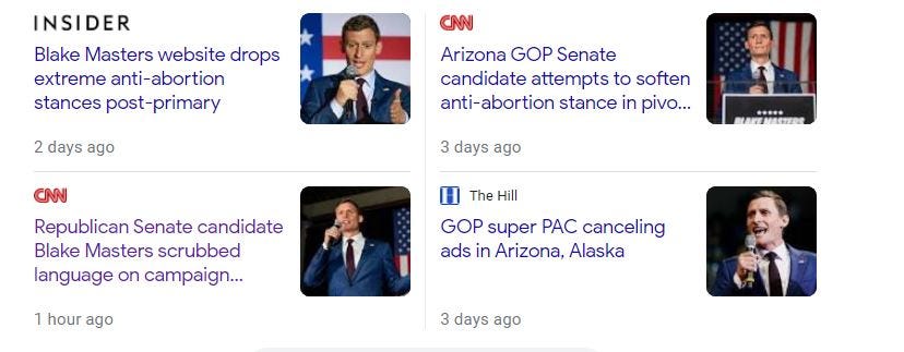 It’s a pretty big tell, if you ask me, turning abortion into one of those wink-and-nod issues with pro-lifers, who heretofore demanded honesty about abortion from Republicans. The pro-life community was very distrustful of flip-floppers when Mitt Romney ran for president, but that went out the window with Donald Trump, whose conversion of convenience gave them the judges needed to overturn Roe, so they were fine with setting principles aside to get the big prize. And boy did that pay off—so don’t expect any pro-lifers to pressure Masters and the others now about inconsistency.