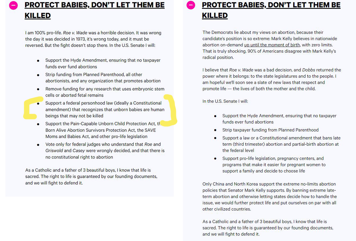 While he was running for the GOP nomination to challenge Sen. Mark Kelly in Arizona, Blake Masters had on his website a pledge to support a federal personhood law or constitutional amendment. That pledge has been deleted (here is a screenshot from May on the left and one from today on the right):