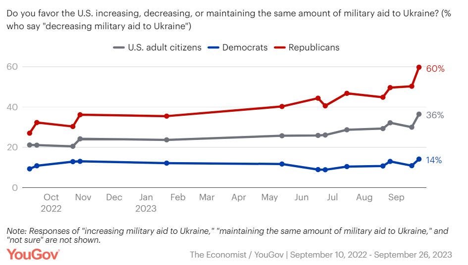 Over the last year, in Economist/YouGov polls, the percentage of Republicans who favor “decreasing military aid to Ukraine” has doubled, from 27 percent to more than 50 percent. In the latest Economist survey on this question, taken a week ago, 60 percent of Republicans said we should reduce aid to Ukraine, and half of that 60 percent wanted to cut off aid entirely. Democrats, by contrast, have hardly budged. Only 14 percent want to reduce the aid.