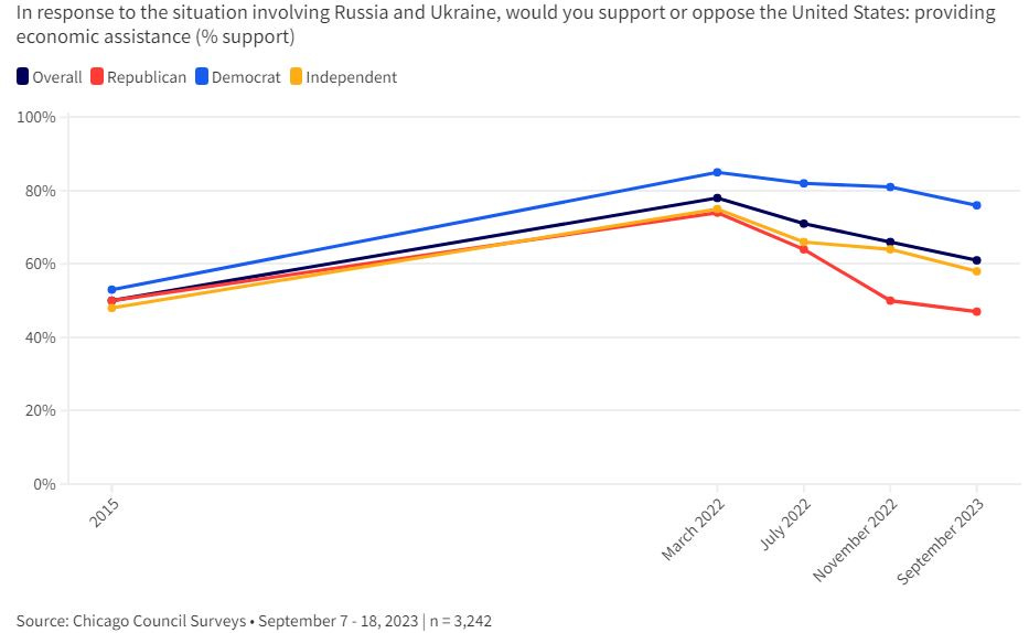 A poll for the Chicago Council on Global Affairs, taken in September and released on Wednesday, underscores the partisan divide. Since March 2022—shortly after Russia’s full-scale invasion—Democratic support for “economic assistance” to Ukraine has declined slightly, from 85 percent to 76 percent. But Republican support has plummeted from 74 percent to 47 percent. Democratic support for “military assistance” remains robust at 77 percent, but Republican support has plunged from 80 percent to 50 percent.