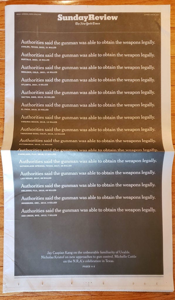 The aftermath of a horrific mass shooting is not the time one would usually turn to a humor site, and yet, the Onion had an insightful take on Uvalde. The headline: “‘No Way to Prevent This’ Says Only Nation Where This Regularly Occurs.” The piece quotes a fictitious citizen: “‘This was a terrible tragedy, but sometimes these things just happen and there’s nothing anyone can do to stop them,’ said Idaho resident Kathy Miller.”